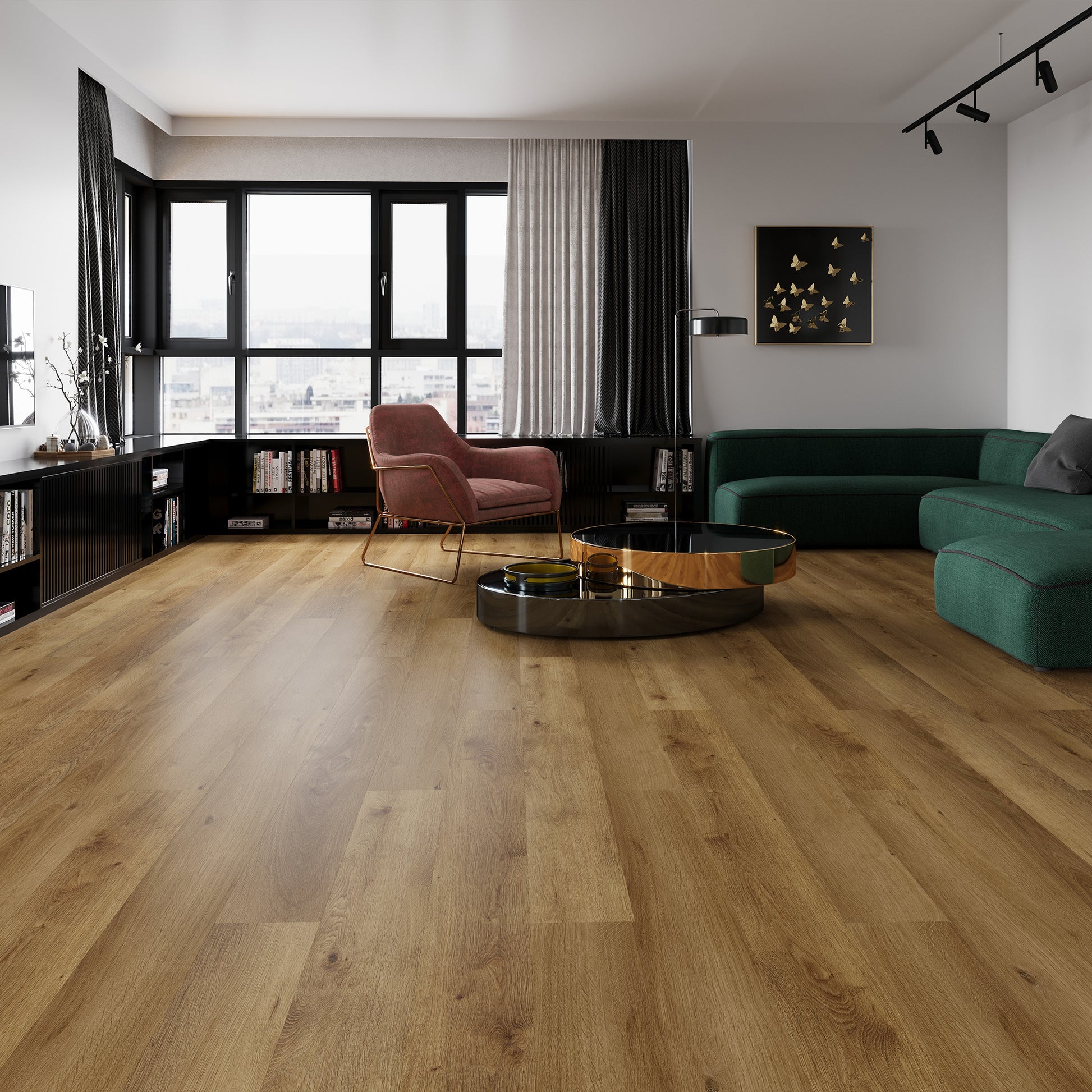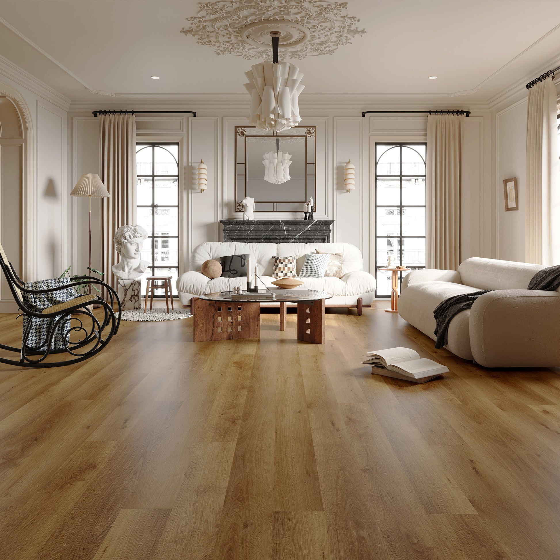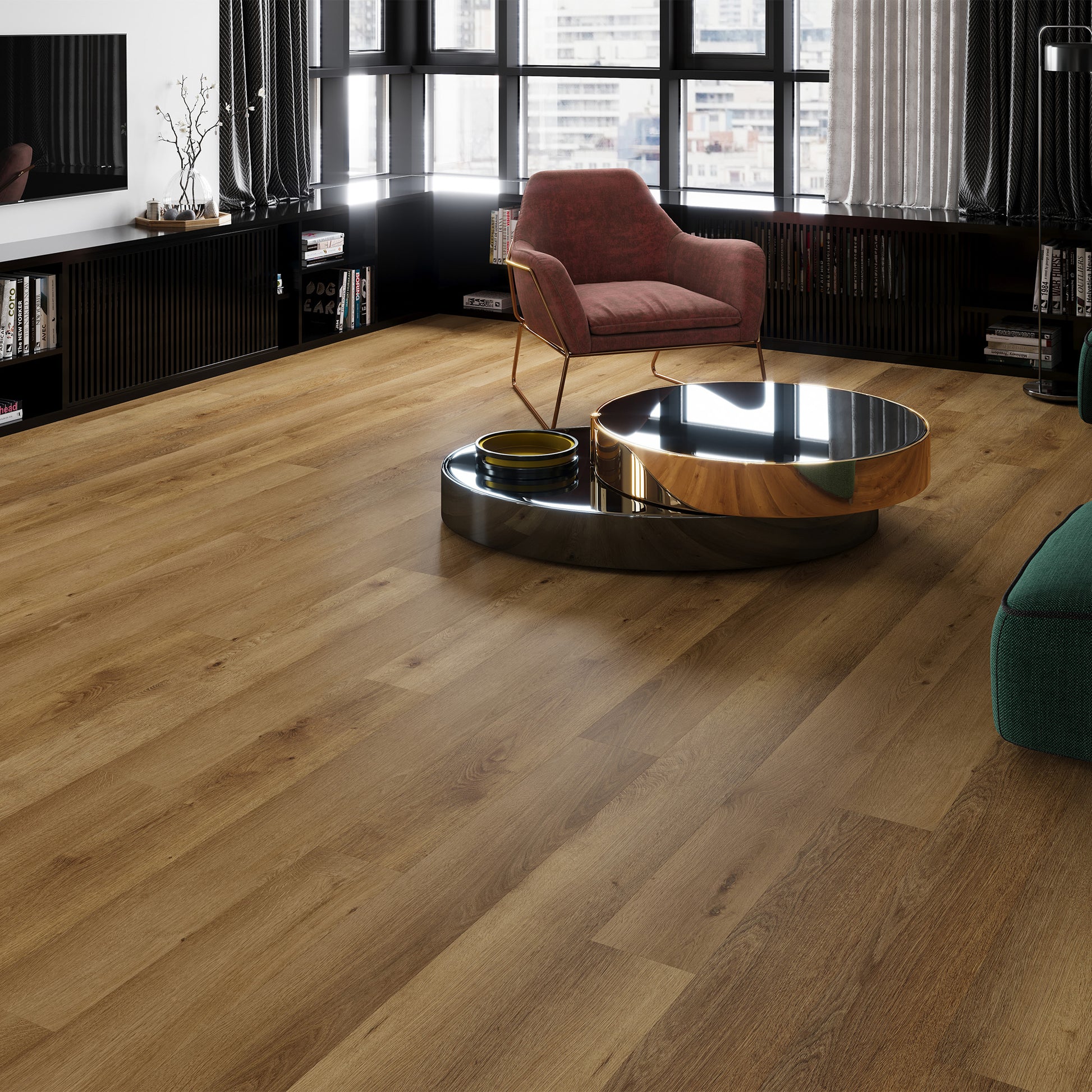 MarlowRigid Core Vinylhas a darker, warm look that gives a room a cozy and grounded feel. The color adds weight to a space without making it feel heavy, helping living areas or bedrooms feel comfortable and welcoming. Designed to look like real wood, it works well with neutral furniture and simple decor, giving the room a settled, easy-to-live-in atmosphere